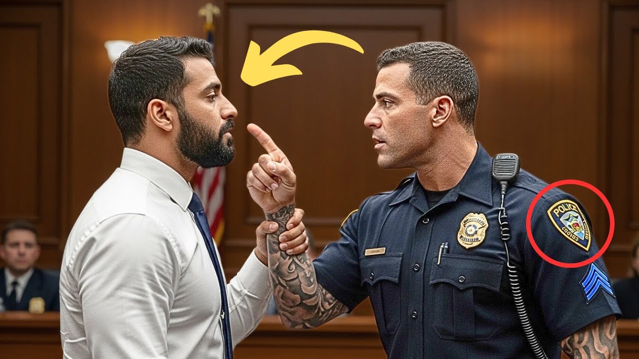 El oficial Torres empujó con violencia al hombre latino dentro del tribunal, tratándolo como un criminal, sin saber que antes de que terminara el día, él mismo sería quien caería de rodillas frente a todos. La sala quedó enmudecida. El estruendo de las bancas retumbó tras la agresión, pero nadie se atrevió a intervenir.