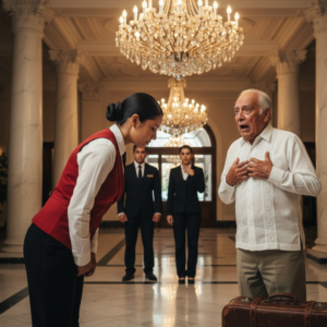 Era una tarde tranquila en el vestíbulo de un lujoso resort, donde las risas de los turistas se mezclaban con el sonido suave de la música ambiental. Sin embargo, la atmósfera cambió en un instante cuando un hombre mayor, con una expresión de incertidumbre, se acercó a la recepción. Su rostro estaba marcado por las huellas del tiempo, su cabello canoso y su traje sencillo lo hacían parecer un viajero común. Pero lo que sucedió a continuación fue algo que ninguno de los presentes esperaba.