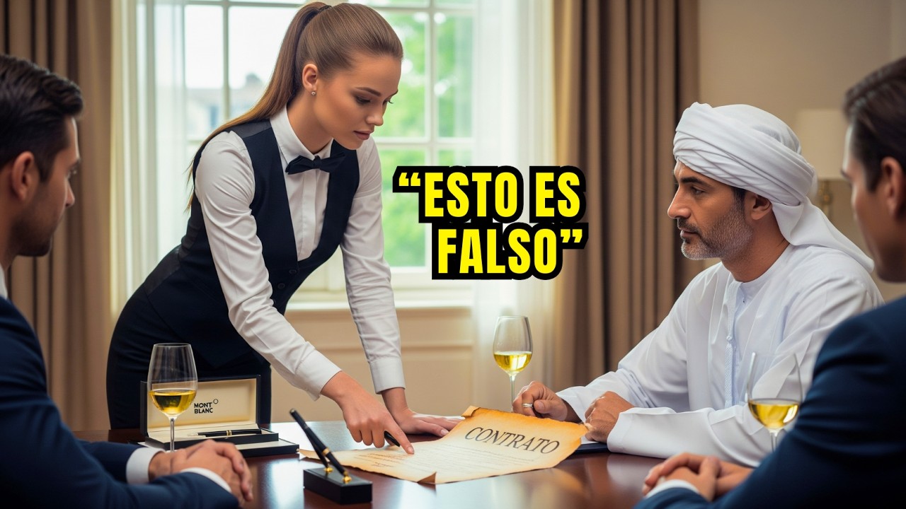 La mano del jeque estaba a punto de firmar. Elena sintió como el corazón le golpeaba el pecho. La garganta se le cerró. Dio un paso adelante sin pensarlo y entonces, con la voz más temblorosa pero decidida que había usado en años, dijo, “No firme.” El salón se congeló. Todos giraron hacia ella, sorprendidos de que la mesera hubiera hablado sin permiso.