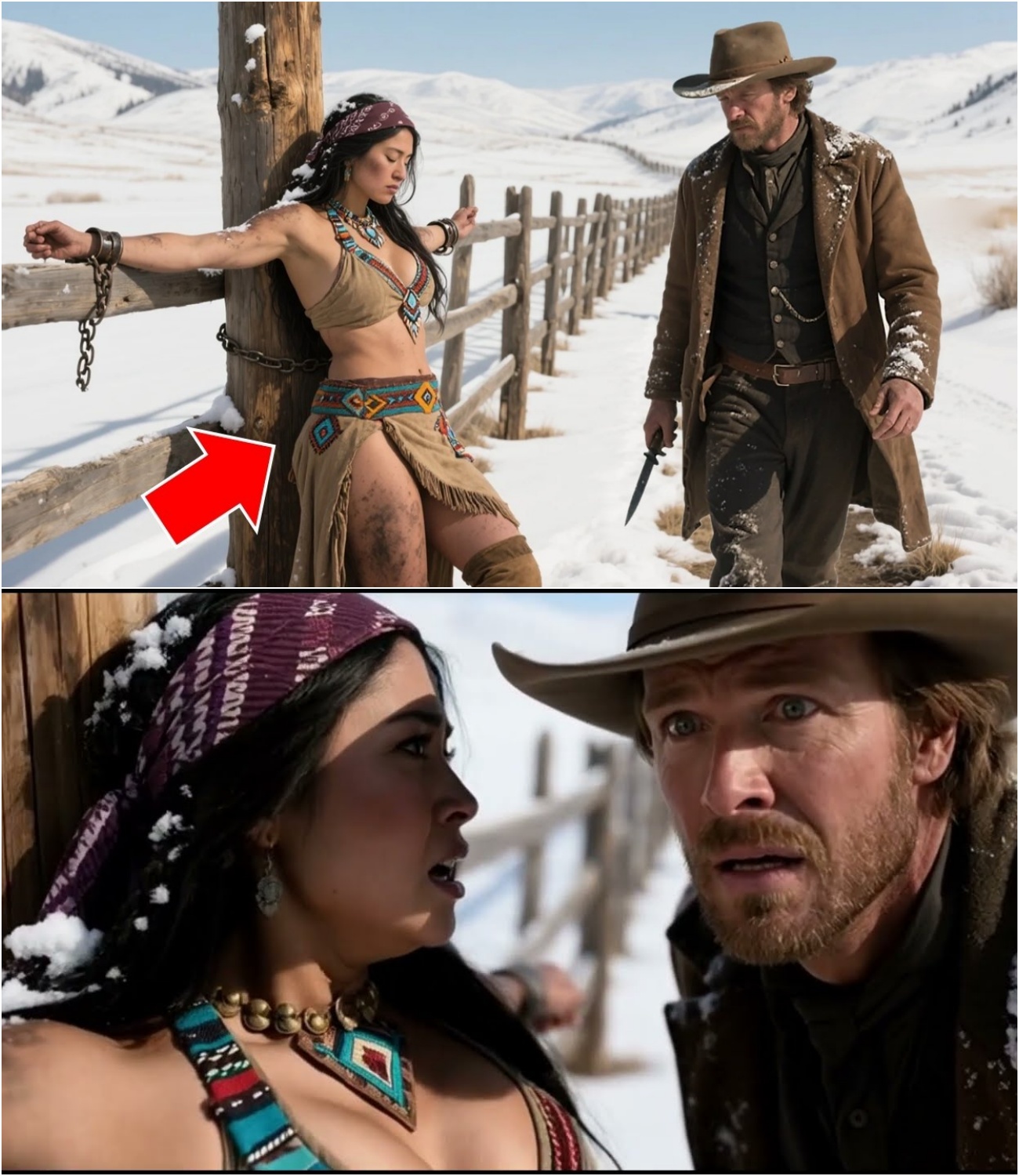 Eli de la Cruz regresaba a su cabaña cuando algo lo hizo frenar en seco. Junto a la cerca, colgada del riel, como si alguien la hubiera dejado ahí para que muriera, había una mujer apache encadenada, congelada, apenas respirando. Eli miró alrededor buscando al desgraciado que la había puesto así.