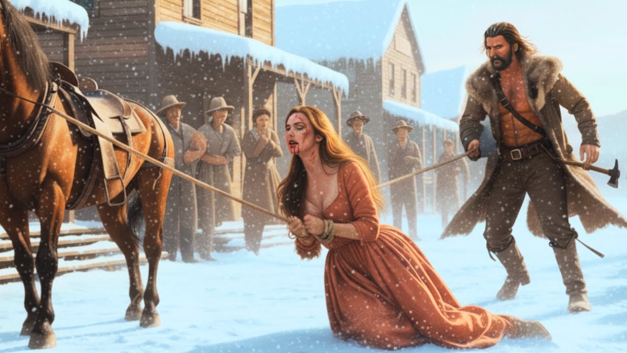 El sol se hundía bajo sobre valle frío, proyectando sombras largas a través de la plaza cubierta de nieve. El mismo lugar donde la humillación había sido espectáculo, ahora crepitaba con anticipación silenciosa. Una multitud se reunió. Rostros tensos con curiosidad y temor. Los niños se aferraron a las faldas, los hombres se apoyaron en postes y las mujeres miraron con mandíbulas apretadas.