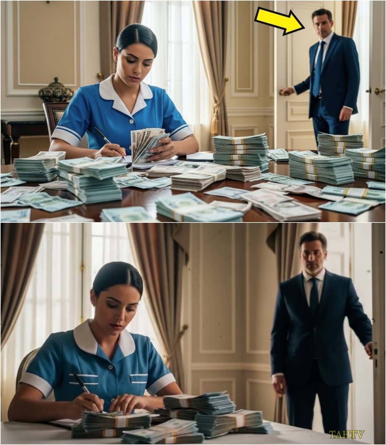 Subió las escaleras de mármol arrastrando su maleta, aflojándose la corbata italiana que parecía estrangularlo después de 14 horas de vuelos y juntas. Al llegar al segundo piso, notó que la luz de su habitación estaba encendida. Extraño. El personal sabía que no debía entrar a su espacio privado sin autorización. giró el pomo de la puerta lentamente y entonces lo vio. Camila Rivera, su empleada doméstica de 24 años, estaba sentada frente a la elegante mesa de caoba que él usaba ocasionalmente para trabajar desde casa, pero no estaba limpiando, no estaba ordenando, estaba rodeada de dinero.