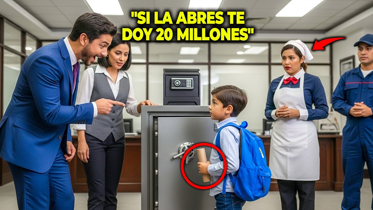 Rosa llegó apresurada, secándose las manos en el delantal, y detrás de ella caminaba su hijo Daniel con su mochila azul y un pequeño tubo de cartón que había usado en una actividad escolar. Don Marcelo señaló la enorme caja fuerte del despacho y dijo con voz firme, “Si tu hijo logra abrirla en 60 segundos, le doy 20 millones a tu madre.