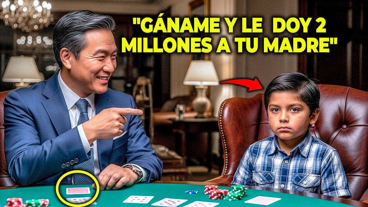 Liang ladeó la cabeza, sorprendido por la calma del chico. La primera mano se jugó sin palabras. El millonario apostó con confianza. Mateo observó cada gesto, cada respiración. Rosa se mordía los labios. Al revelar las cartas, Mateo ganó. Liang soltó una risa breve. Golpe de suerte. La segunda ronda fue más tensa.