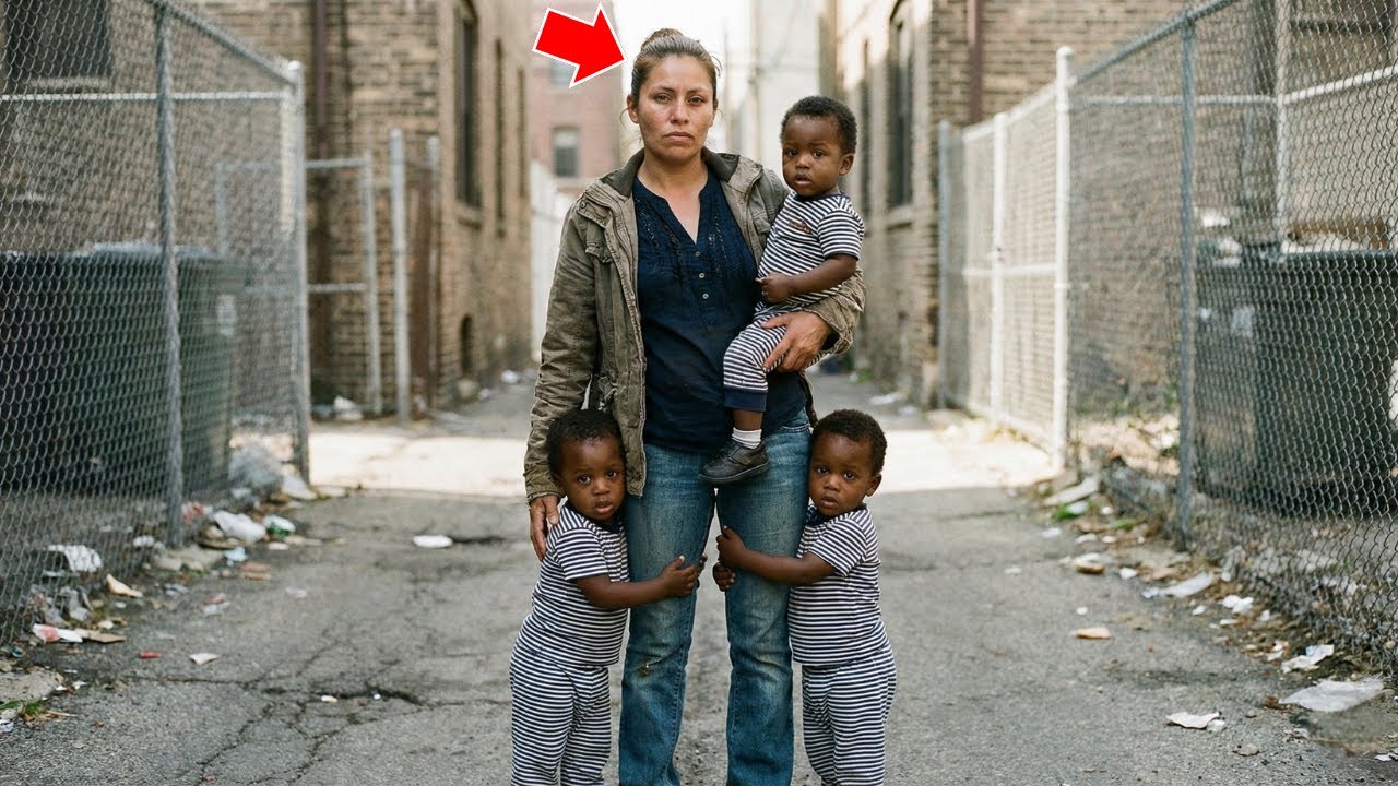 En sus brazos sostenía firmemente a Gabriel, un niño negro de ojos atentos, mientras sus hermanos idénticos, Miguel y Rafael, se aferraban a las piernas de los pantalones de mezclilla desteñidos de su madre, como si fueran los pilares de su único templo seguro, aquel instante en el callejón quedaría grabado para siempre, no solo en la memoria del vecindario, sino en una fotografía tomada por casualidad en aquel día gris.
