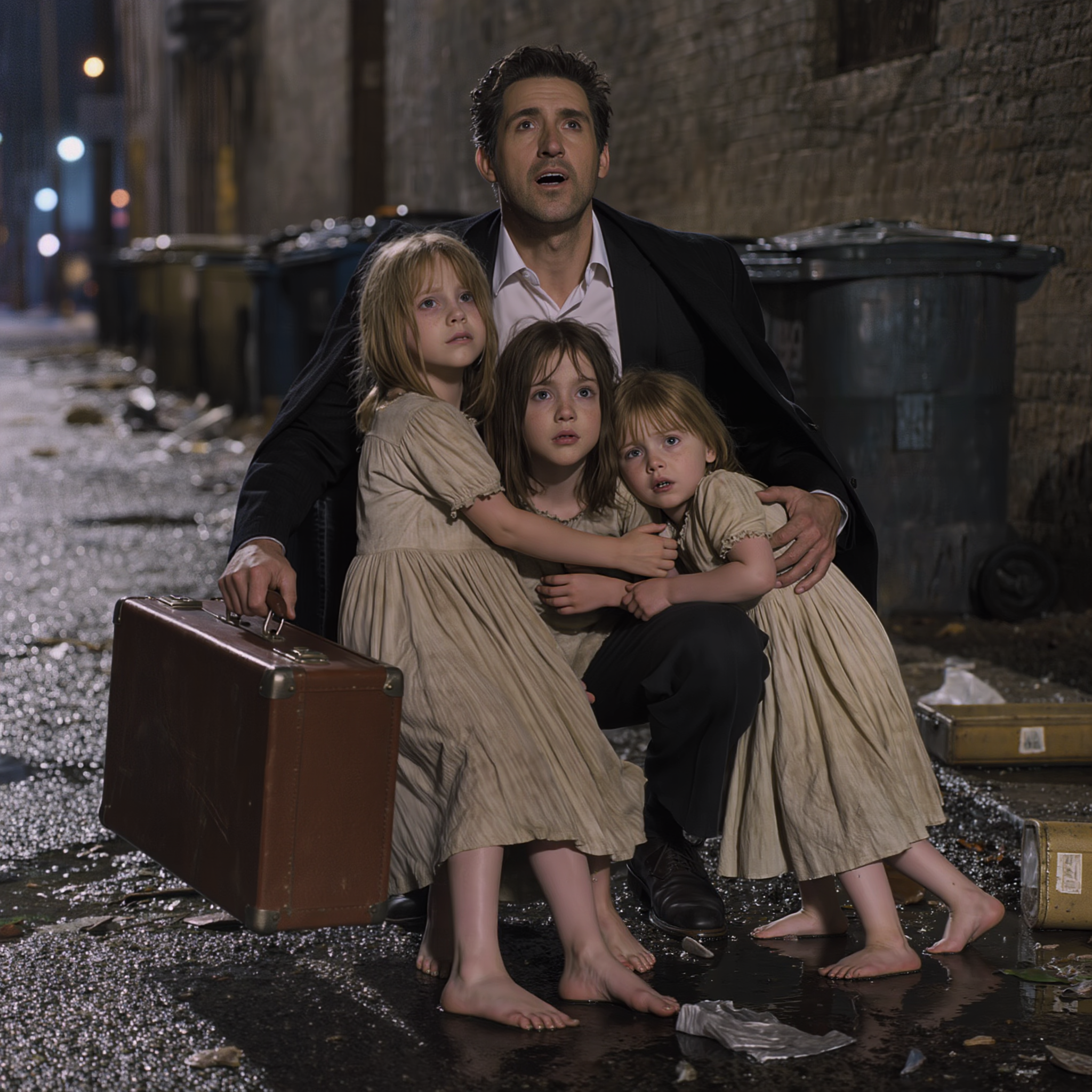 Ali, encostadas na parede úmida, perto de um lixeiro velho e fedorento, estavam suas três filhas, Sofia, Laura e Marina, sujas, com roupas rasgadas. abraçadas umas às outras como se fossem morrer, os cabelos grudados no rosto, os pés descalços sangrando. A mais velha, Sofia, segurava as duas irmãs menores com força, tremendo de frio e de medo.