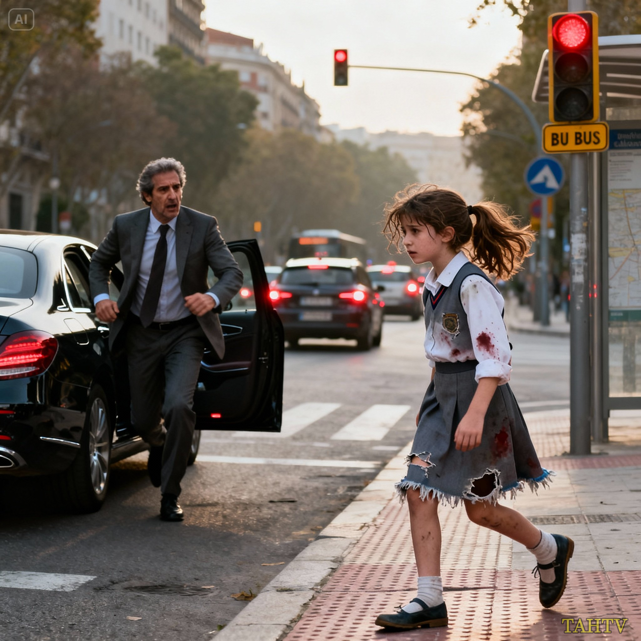 El semáforo cambia a verde, pero Esteban no se mueve. Los carros detrás comienzan a tocar el claxon. Finalmente gira bruscamente hacia la derecha y estaciona en doble fila, sin importarle las multas. Sale del carro y camina rápidamente hacia su hija. Sofía. La niña se gira y cuando ve a su padre, sus ojos se abren enormes.