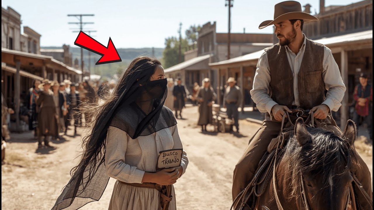 detuvo su caballo frente al almacén general, donde un grupo de mujeres del pueblo murmuraba alrededor de una figura solitaria. Era una mujer apache cubierta con un velo oscuro que ocultaba completamente su rostro. Llevaba un vestido sencillo pero limpio y en sus manos sostenía un pequeño cartel escrito en español: “Busco trabajo. Soy buena cocinera y enfermera.